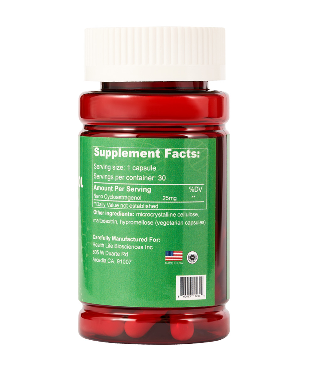 The first Nano cycloastragenol with enteric-coated capsules. Nano technology increased absorption up 200% to 300%.
