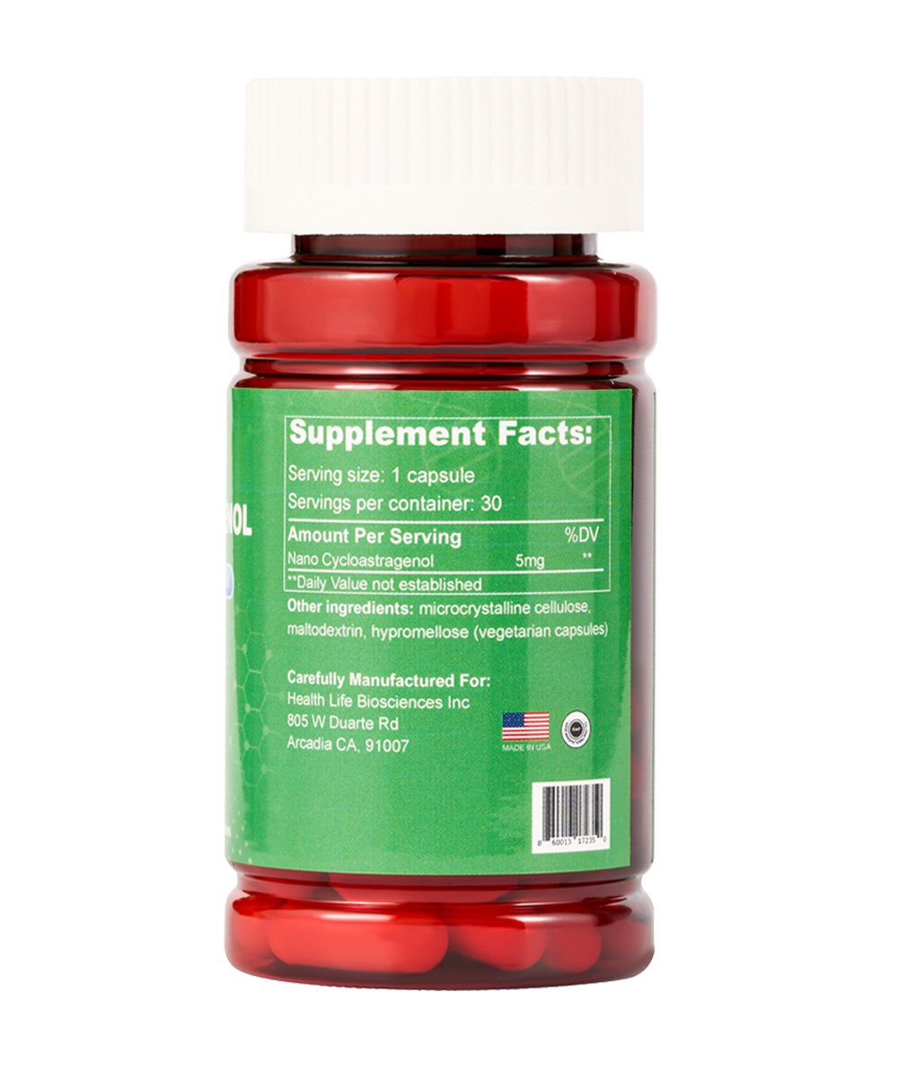 The first Nano cycloastragenol with enteric-coated capsules. Nano technology increased absorption up 200% to 300%.