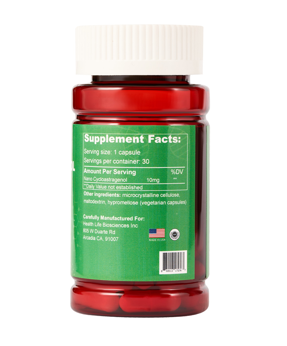The first Nano cycloastragenol with enteric-coated capsules. Nano technology increased absorption up 200% to 300%.